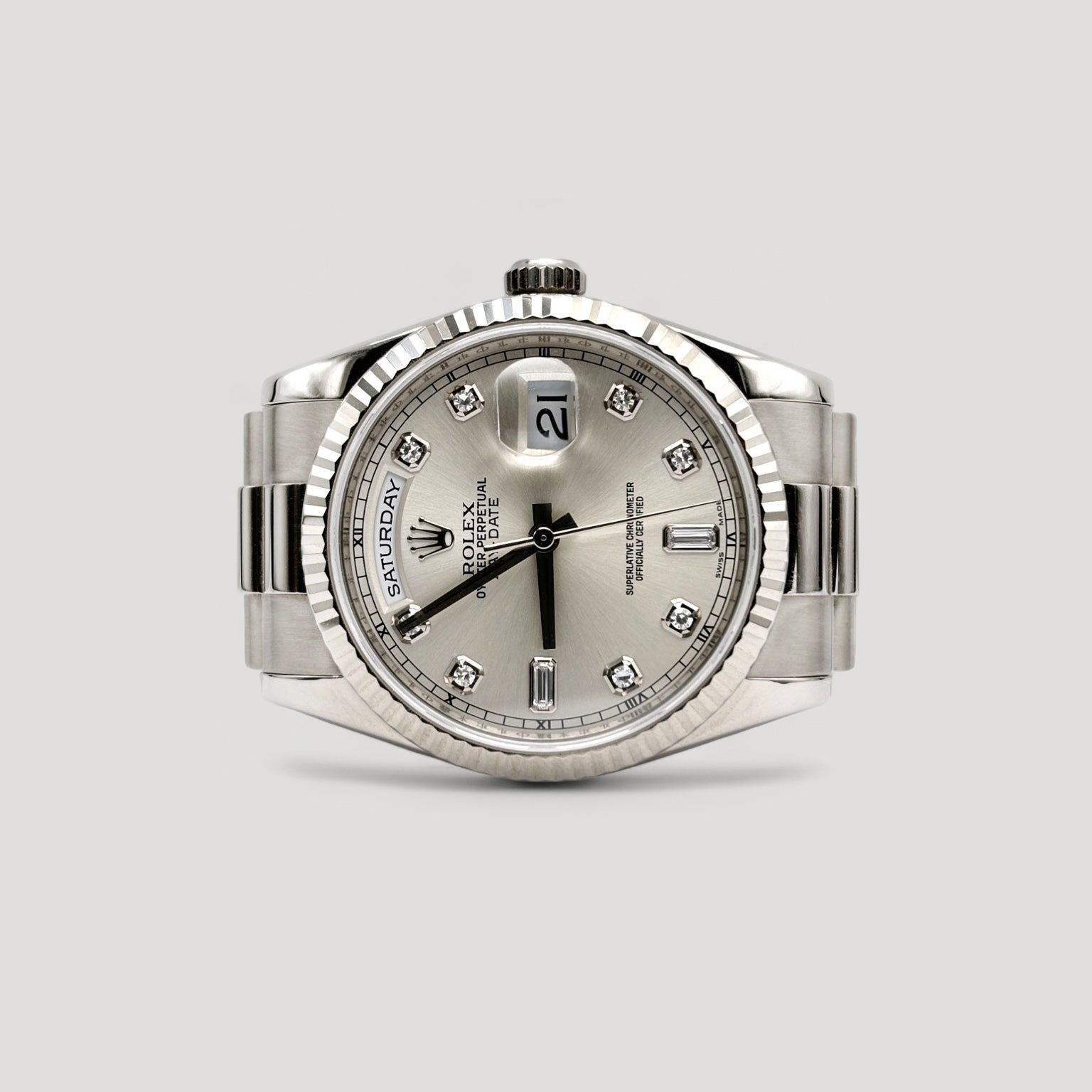 Mint Rolex Day Date "President" Silver w/ Baguette Diamond 36mm 118239