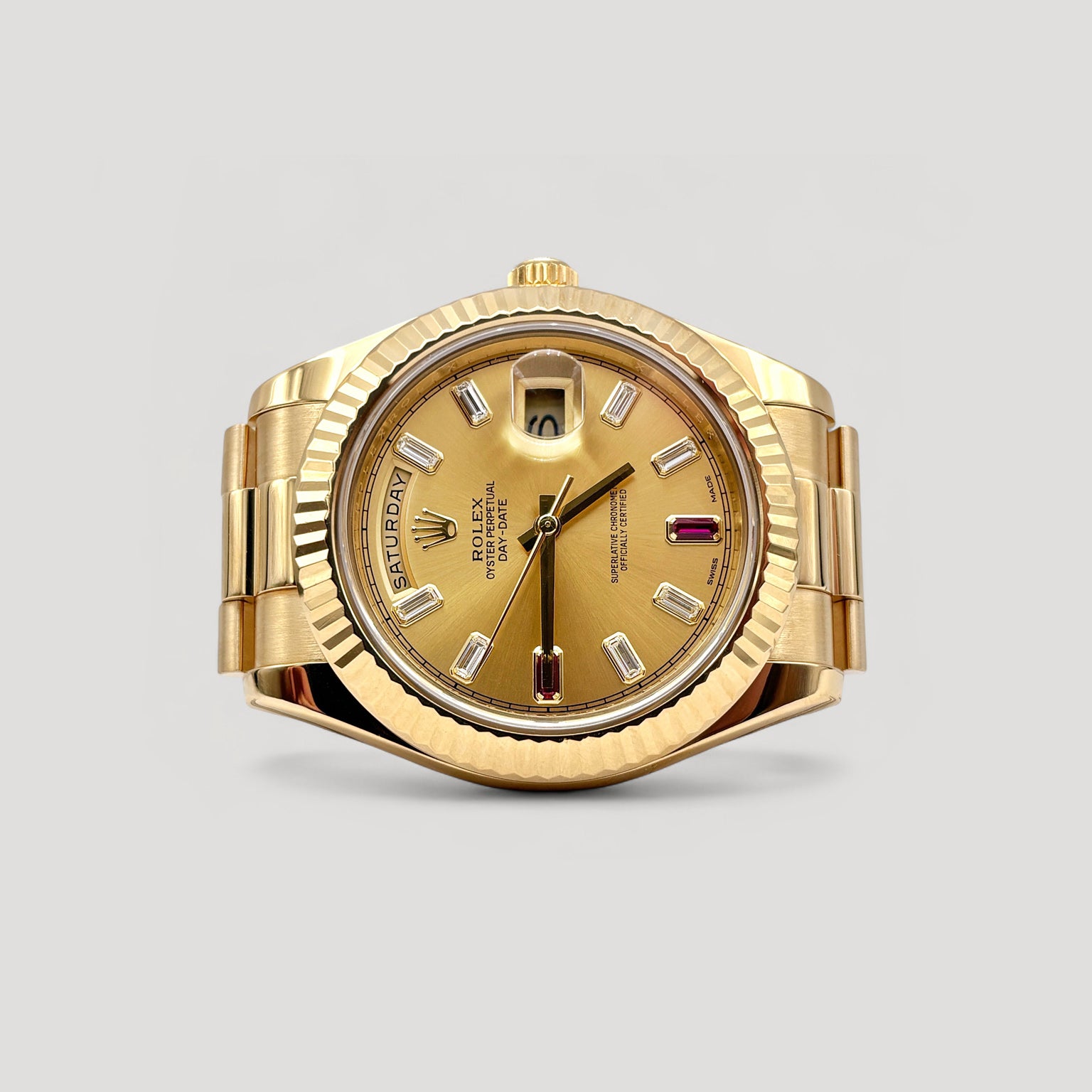 Mint Rolex Day Date Champagne w/ Baguette & Ruby Diamond President Yellow Gold 41mm 218238