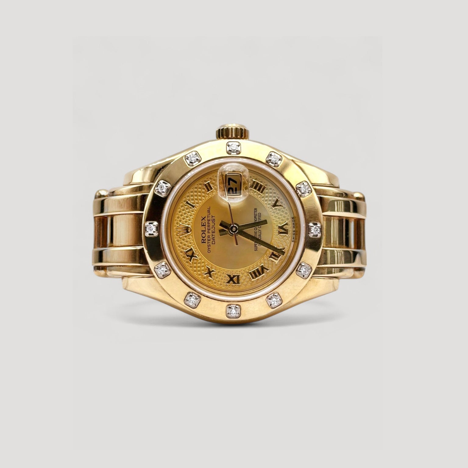 Rolex Datejust Pearlmaster Decorated Champagne MOP Roman with Factory Diamond Bezel YG 29mm 80318